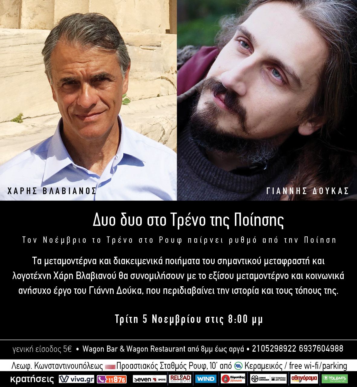 Από Τρίτη 5 και για όλες τις Τρίτες του Νοεμβρίου οκτώ σημαντικοί και καταξιωμένοι Έλληνες ποιητές επιβιβάζονται στην Αμαξοστοιχία και μας οδηγούν στα προσωπικά ποιητικά τους μονοπάτια.