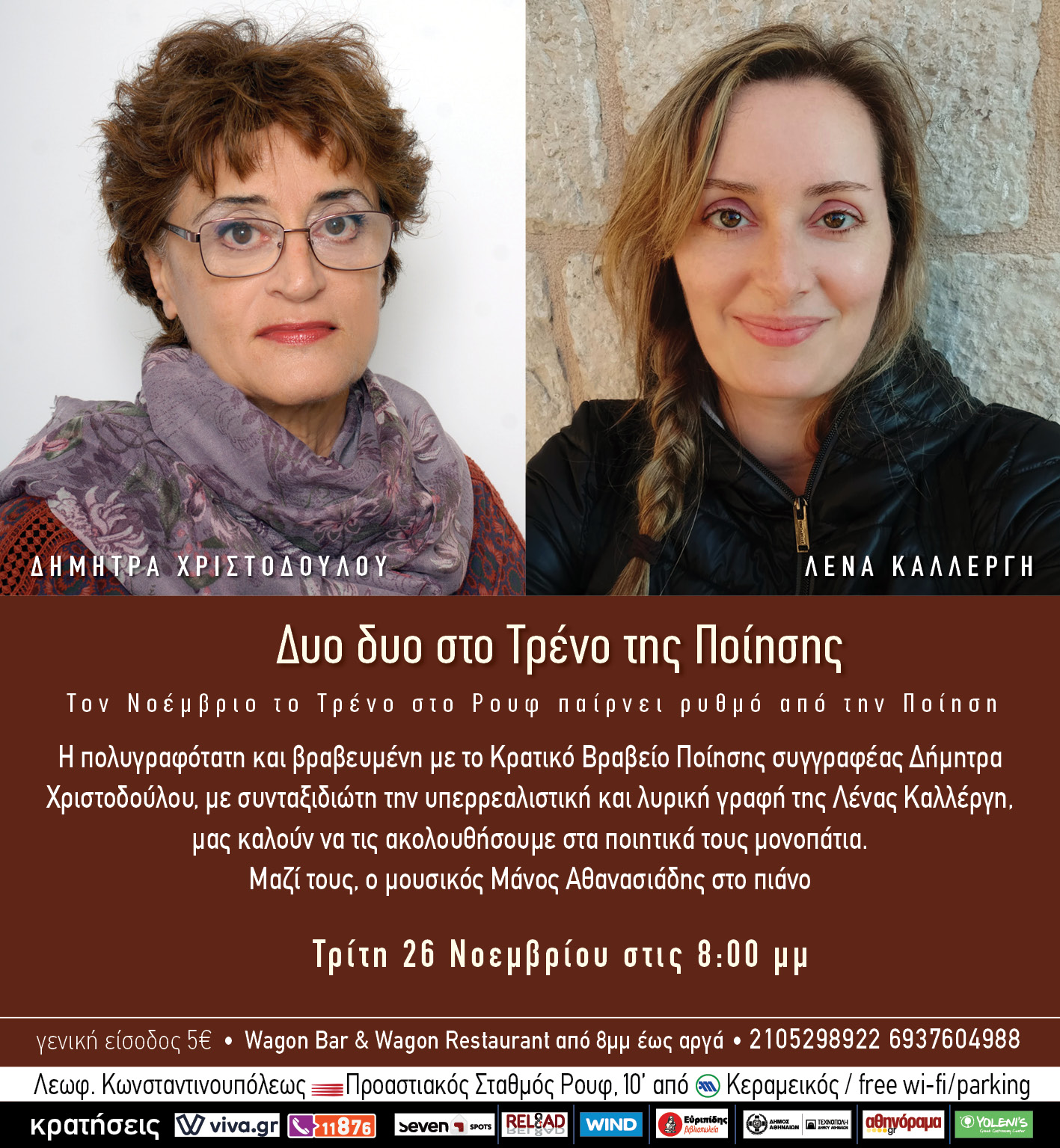 Η σπουδαία εκπρόσωπος της γενιάς του ’70, βραβευμένη με το Κρατικό Βραβείο Ποίησης Δήμητρα Χριστοδούλου, με συνταξιδιώτη την υπερρεαλιστική και λυρική γραφή της επίσης βραβευμένης Λένας Καλλέργη, μας καλούν να τις ακολουθήσουμε στην ποιητική τους περιπλάνηση στον κόσμο των λέξεων.