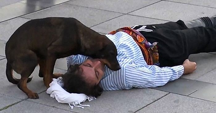 Κατά τη διάρκεια μιας θεατρικής παράστασης στο δρόμο, το σενάριο είχε τον ηθοποιό να ξαπλώνει στο πάτωμα τραυματισμένος. Φυσικά, ο τραυματισμός του ήταν προσποιητός, κάτι που ήταν σαφές σε όλους τους παρευρισκόμενους. Ή μάλλον πιο σωστά, σχεδόν σε όλους.
