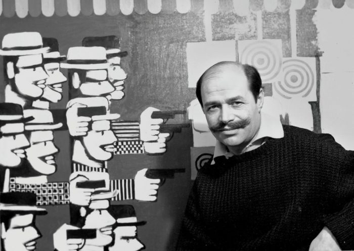 Δεν παρέλειπε ποτέ να διακωμωδεί από τον απλό λαϊκό άνθρωπο μέχρι τους πολιτικούς και τους θεσμούς, το ίδιο το σύστημα τελικά, σε πίνακες, γλυπτά, εγκαταστάσεις, χάπενινγκ, προσπαθώντας να ταράξει τα νερά, να τραβήξει την προσοχή, να αφυπνίσει, να ευαισθητοποιήσει στο τι σημαίνει ο θάνατος του Τσε, η Χιλή του Αλιέντε, ο πόλεμος του Βιετνάμ, η ‘’Κηδεία της ζωγραφικής’’, η χούντα της Ελλάδας… Με πίνακες στους οποίους συμμετέχουν απαθείς συνοδοιπόροι, οι άνδρες-ανδρείκελα με τα μαύρα καπέλα και τα ριγέ κοστούμια που θυμίζoυν τις στολές των φυλακισμένων.