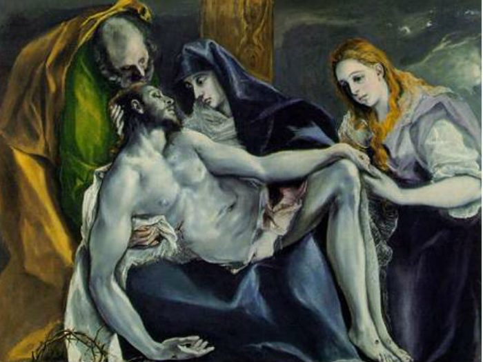 Ο αγαπημένος μαθητής του Χριστού, ο Ιωάννης, ανακρατεί με το ένα χέρι το γερμένο κεφάλι του Χριστού και με το άλλο το νεκρό χέρι του. Είναι σε στάση υπόκλισης. Υποκλίνεται μπροστά στη θεία μεγαλειότητα. Προσκυνεί κατά κάποιο τρόπο το πάθος, ανυμνεί την ταφή και μεγαλύνει τη θεία δύναμη, με τα οποία λυτρώθηκε ο άνθρωπος από την θανατηφόρα αμαρτία.