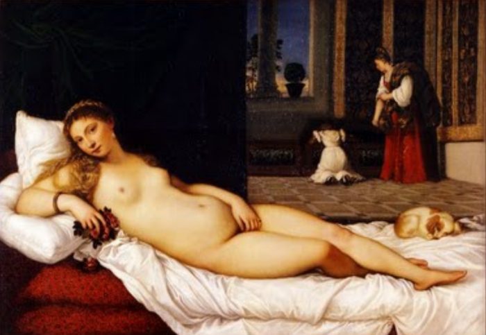 Ο πίνακας του Τιτσιάνο αποτελεί αναφορά στην στάση της μορφής της Αφροδίτης που καθιέρωσε ο Τζορτζόνε (Κοιμωμένη Αφροδίτη, 1510). Ο Τιτσιάνο ωστόσο, επιλέγει να μεταφέρει την Αφροδίτη του μέσα σε μια σκηνή της καθημερινότητας, καταφέρνοντας έτσι για πρώτη φορά να δημιουργήσει μια σύνδεση της φιγούρας της γυμνής θεάς με μια οποιαδήποτε γυναίκα της καθημερινότητας.