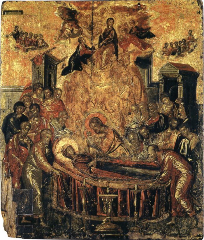 Η Κοίμηση της Θεοτόκου από τον Francesco Botticini.Antonio da Correggio, 1489-1534, καθεδρικός ναός της Πάρμας.Και για τέλος:Η Κοίμηση της Θεοτόκου [Ο διάσημος πίνακας του Δομήνικου Θεοτοκόπουλου (Ελ Γκρέκο) που χρονολογείται στα 1565-1566, όσο ο καλλιτέχνης βρισκόταν στην Κρήτη.]Οι πίνακες του Δομήνικου Θεοτοκόπουλου είχαν θεματικές παρμένες κυρίως από τη χριστιανική παράδοση. Δύο ήταν κυρίως οι γυναικείες μορφές που εμφανίζονταν στα έργα του καλλιτέχνη, η Παναγία και η Μαρία η Μαγδαληνή. Η απεικόνιση των μορφών αυτών δεν ήταν κάθε φορά η ίδια αλλά εξελίσσονταν ανάλογα με τις επιρροές του Γκρέκο και την εξέλιξη και ωρίμανσή του ως καλλιτέχνη κατά τη διάρκεια της ζωής του. Οι επιρροές του Γκρέκο ήταν πολλές αν αναλογιστεί κανείς την εποχή που ζει, τα διαφορετικά καλλιτεχνικά ρεύματα που συνυπάρχουν (Μανιερισμός, Μπαρόκ, Ροκοκό), τα μέρη που έζησε (Κρήτη- Ιταλία-Ισπανία) καθώς και τους καλλιτέχνες με τους οποίους ήρθε σε επαφή (Μιχαήλ Άγγελος, Τιτσιάνο).Πρώτο αντιπροσωπευτικό έργο της νεανικής καλλιτεχνικής περιόδου του Γκρέκο, που αποτελεί και το παλαιότερο χρονολογικά έργο που διασώζεται, είναι η εικόνα της Κοιμήσεως της Θεοτόκου (Ερμούπολη Σύρου). Η καινοτομία που παρουσιάζει ο Γκρέκο δεν έγκειται στη θεματική της εικόνας, αφού αποτελεί κλασική θεματική της «Κρητικής Σχολής» παρμένη από τα απόκρυφα ευαγγέλια αλλά στο συνδυασμό πολλών αναγεννησιακών και παλαιολόγειων στοιχείων με το κλασικό. Η εικόνα της Παναγίας εδώ χαρακτηρίζεται από γλυκύτητα, κίνηση και χάρη ενώ οι άλλες γυναικείες μορφές θρηνούν, όλες αποτυπωμένες κατά τα βυζαντινά πρότυπα.