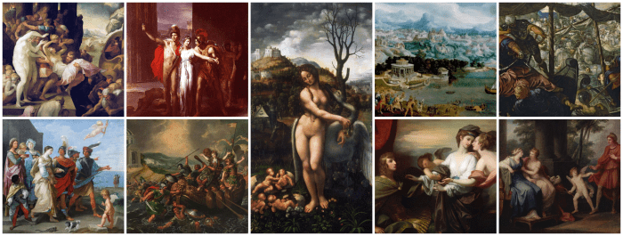 Το πανέμορφο πανόραμα του Maerten van Heemskerck με την απαγωγή της Ελένης μέσα στα θαύματα του αρχαίου κόσμου (1535) βάζει την ίδια ιστορία σε ένα παγκοσμίου φήμης πανόραμα που περιλαμβάνει κλασικά «θαύματα» όπως ο Κολοσσός της Ρόδου. Η Ελένη είναι εδώ μέρος μιας μικρής επιδρομής στη Σπάρτη, στην οποία αρπάζονται επίσης διάφορα άλλα λάφυρα.