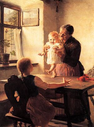Το σκηνικό διαδραματίζεται στο εσωτερικό ενός βαυαρικού σπιτιού, ίσως αστικού. Η γιαγιά, έχει αφήσει στην άκρη το πλεκτό της και κρατά επιδέξια την εγγονή της, ένα ξανθό βρέφος, βοηθώντας τη να διατηρήσει την ισορροπία της και να περπατήσει πάνω στο ξύλινο τραπέζι. Απέναντι τους (με την πλάτη στον παρατηρητή) κάθεται η μεγαλύτερη αδελφή του μωρού, η οποία ανοίγει προστατευτικά τα χέρια της, τεντωμένα ως τις άκρες των δακτύλων, σε μια χειρονομία που φαίνεται να ενθαρρύνει τη μικρή αδελφή να πλησιάσει. Το βρέφος φαίνεται χαρούμενο, έτοιμο να αφήσει την ασφάλεια της αγκαλιάς και να περπατήσει μόνο του. Η γιαγιά του το κοιτάζει με τρυφερότητα, αγάπη και σιγουριά. Την ξεγνοιασιά, την απλότητα μιας τόσο όμορφης και ευτυχισμένης οικογενειακής στιγμής πλαισιώνει η χρήση του φωτός από το ζωγράφο, που κάνει τη μικρή εγγονή να ακτινοβολεί σχεδόν και φωτίζει τα πρόσωπα του βρέφους και της γιαγιάς, αναδεικνύοντας τις εκφράσεις τους.