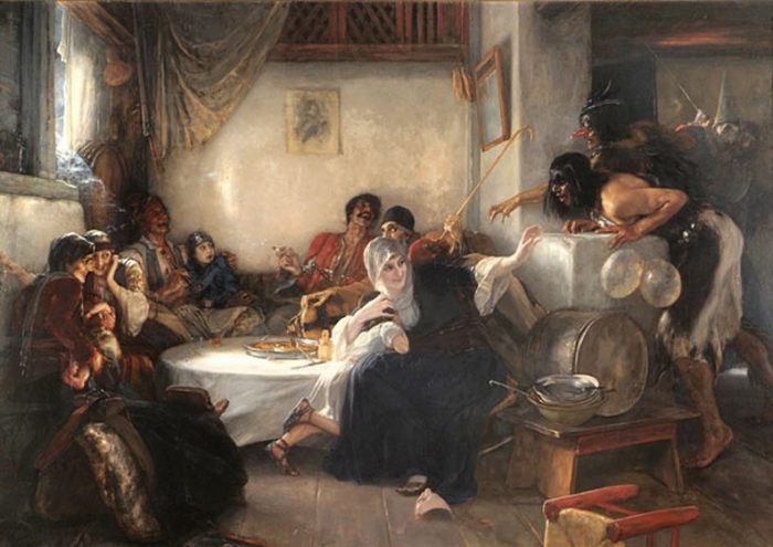 «Πρόκειται για ελαιογραφία σε μουσαμά που ολοκληρώθηκε το 1892 μετά από τουλάχιστον μία δεκαετία πειραματισμών και έρευνας πάνω στην σύνθεση και την λειτουργία του φωτός στο έργο», αναφέρει ο διευθυντής του Μουσείου Στέφανος Καβαλλιεράκης. Στο εσωτερικό ενός φτωχικού σπιτιού, στα μέσα του 19ου αιώνα, μία οικογένεια καθισμένη γύρω από το τραπέζι, διασκεδάζει με το έθιμο των μασκαράδων όταν αυτοί εισβάλουν για να τρομάξουν τα παιδιά. Η σκηνή, λουσμένη σε ένα ζεστό φως που μπαίνει από το παράθυρο, ανακατεύεται με τη μυρωδιά του γαλακτομπούρεκου, τον καπνό απ’ το τσιγάρο και τις αγκαλιές των παιδιών. Οι αισθήσεις και τα συναισθήματα κυριαρχούν σε αυτό το αριστουργηματικό έργο που αποτελεί αναμφίβολα ένα από τα καλύτερα του κορυφαίου.Η αντιπαράθεση του διονυσιακού και του απολλώνιου στοιχείου, η αναμέτρηση του φωτός και της σκιάς, της οικογενειακής ζωής και των εκστασιασμένων καρναβαλιστών ως ένα είδος δαιμόνων – όλα αυτά δημιουργούν ένα έργο εξαίσιο που ξεφεύγει από την παγίδα τού να αποτελεί ένα απλό, άκακο και αφελές βουκολικό ενσταντανέ».