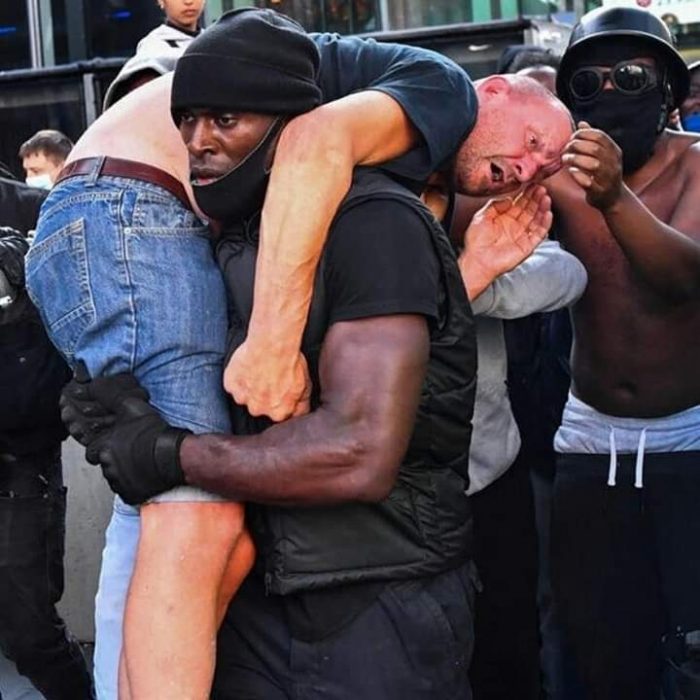 Ο διαδηλωτής του Black Lives Matter, Πάτρικ Χάτσινσον, σε αντιρατσιστική πορεία τον Λονδίνο, κουβαλά στους ώμους του τον τραυματισμένο ακροδεξιό διαδηλωτή για να τον σώσει από το πλήθος και τον πάει τρέχοντας για ιατρική βοήθεια.