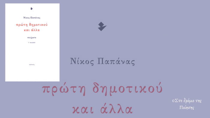 Μια συλλογή που σηματοδοτεί το ποιητικό ντεμπούτο του Νίκου Παπάνα η «πρώτη δημοτικού και άλλα» που κυκλοφορεί από τις εκδόσεις Ιωλκός μας τοποθετεί ξανά πίσω από ένα θρανίο: μόνο που αυτή την φορά δεν είναι το σχολικό, αλλά εκείνο της ζωής. Ξάφνου εκείνη στέκεται μπροστά μας σαν το τετράδιο ενός μαθητή που δεν επιδιώκει διόλου να μετατραπεί σε δάσκαλο. Αντιθέτως, το τετράδιο εκείνο, ως νέο αλφαβητάρι, διαγράφει την πορεία μιας ολόκληρης ζωής. Είναι η ζωή του ποιητή ή η δική μας; Δύσκολα διακρίνουμε. Ωστόσο, με λαιμαργία, γυρίζουμε τις σελίδες και χανόμαστε στις γραμμές και τους στίχους της, για να μας αφήσουν στο τέλος μια γεύση πικρόγλυκη.