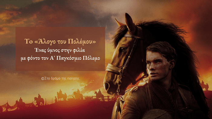 Η ταινία που επιλέξαμε να σας παρουσιάσουμε σήμερα είναι το «Άλογο του Πολέμου» που παρακολουθήσαμε ξανά πρόσφατα στην τηλεόραση και μας υπενθύμισε για ποιους λόγους αγαπήσαμε τη συγκεκριμένη ταινία· πρόκειται για μια ωδή στην φιλία, μια υπέροχη ιστορία με φόντο τον Α’ Παγκόσμιο Πόλεμο και με θέμα τον αγνό δεσμό που αναπτύσσεται μεταξύ του πρωταγωνιστή, του Άλμπερτ, και ενός αλόγου.