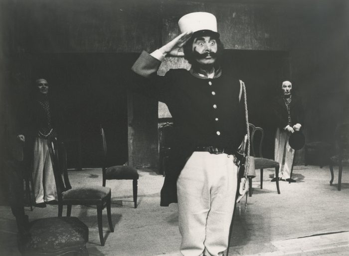 Μπροστά: Νίκη Τουλουπάκη (Γυναίκα του Καρόμπκιν), Ιάκωβος Ψαρράς (Αντών Αντόνοβιτς Ντμουχανόφσκι). Αριστερά: Μαίρη Ιγγλέση (Μαρία Αντώνοβνα). Δεξιά: Γιάννης Λιακάκος (Στεπάν Ίλιτς), Κνετρική Σκηνή Εθνικού Θεάτρου, 1988