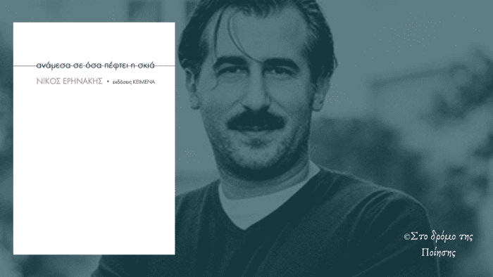 Η συλλογή «Ανάμεσα σε όσα πέφτει η σκιά» του Νίκου Ερηνάκη που κυκλοφορεί από τις εκδόσεις Κείμενα, είναι μια κατάδυση στην ουσίας με οξυγόνο την ποίηση και πυξίδα την φιλοσοφία σε μια θάλασσα φουρτουνιασμένη και επικίνδυνη- στον ωκεανό του σύγχρονου κόσμου. Ο Νίκος Ερηνάκης, σαν έμπειρος δύτης, αναζητά μέσα τους τις ισορροπίες εκείνες που θα του μαρτυρήσουν το νόημα της ύπαρξης, χωρίς όμως να λησμονεί πως αποτελεί μέρος ενός όλου, χωρίς να αποπροσανατολίζεται, όπως μας εξαναγκάζει κατά καιρούς η θαλασσοταραχή. Πάμε να την γνωρίσουμε μαζί!